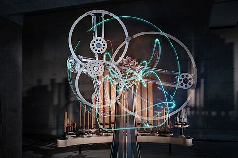 In this hypnotic performance, the artist explores the tensions between the global currents that drive planetary equilibrium, and the intimate currents that resonate within each of us. Fifteen suspended devices, veritable kinetic sculptures, orchestrate the flow of water particles in real time, materializing oceanic dynamics. The patterns generated, fed by data such as the temperature and salinity of the Pacific Ocean, intertwine in a visual and sonic choreography. 1 drop 1000 years reveals itself as a masterful, poetic ballet, conveying the fragility of ecosystems and the delicate harmony that binds all things on Earth.
