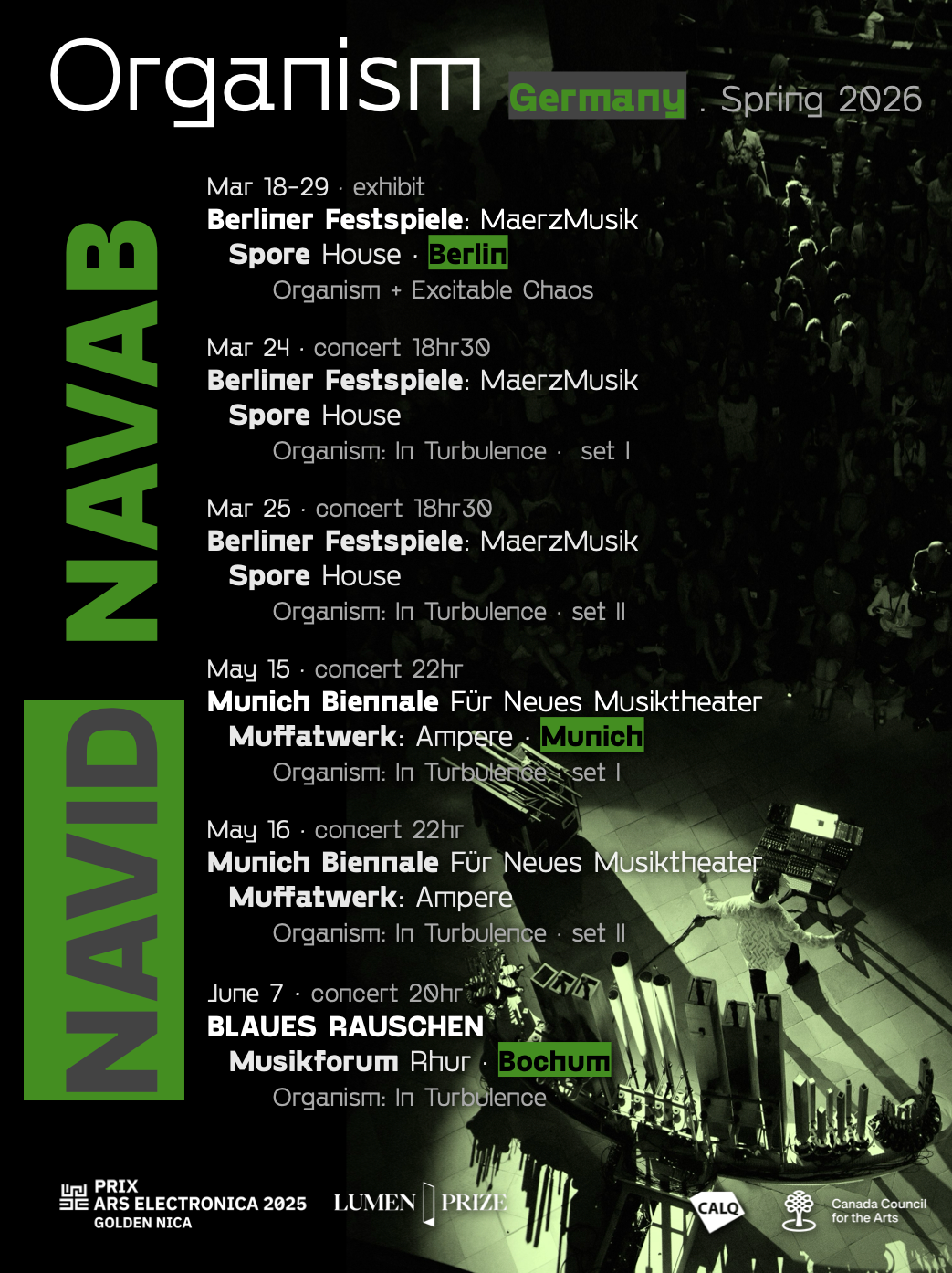 During concerts, shifting metastable states allow for energetic thresholds to fall into and out of compatibility with one another. Navab shapes this ecology of interdependent timbres into emergent realms, traversing microsonic-polyrhythms, post-rock overspill and swampy-soundscapes. In the installation version, Organism + Excitable Chaos (created in collaboration with Garnet Willis), the chaotic motion of Excitable Chaos, a robotically-steered triple pendulum, drives the aerodynamic thresholds of Organism, the robotically-prepared century-old pipe organ.