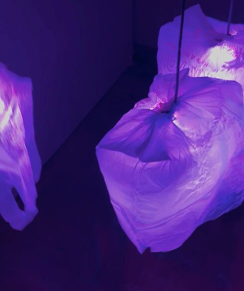 wilderness - Thirteen disposable plastic shopping bags playfully dance in the gallery space articulated by wave data collected on a voyage across the Pacific Ocean.
